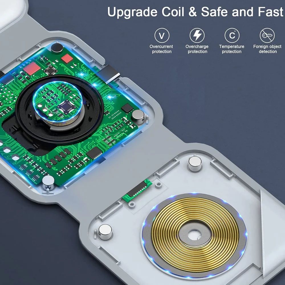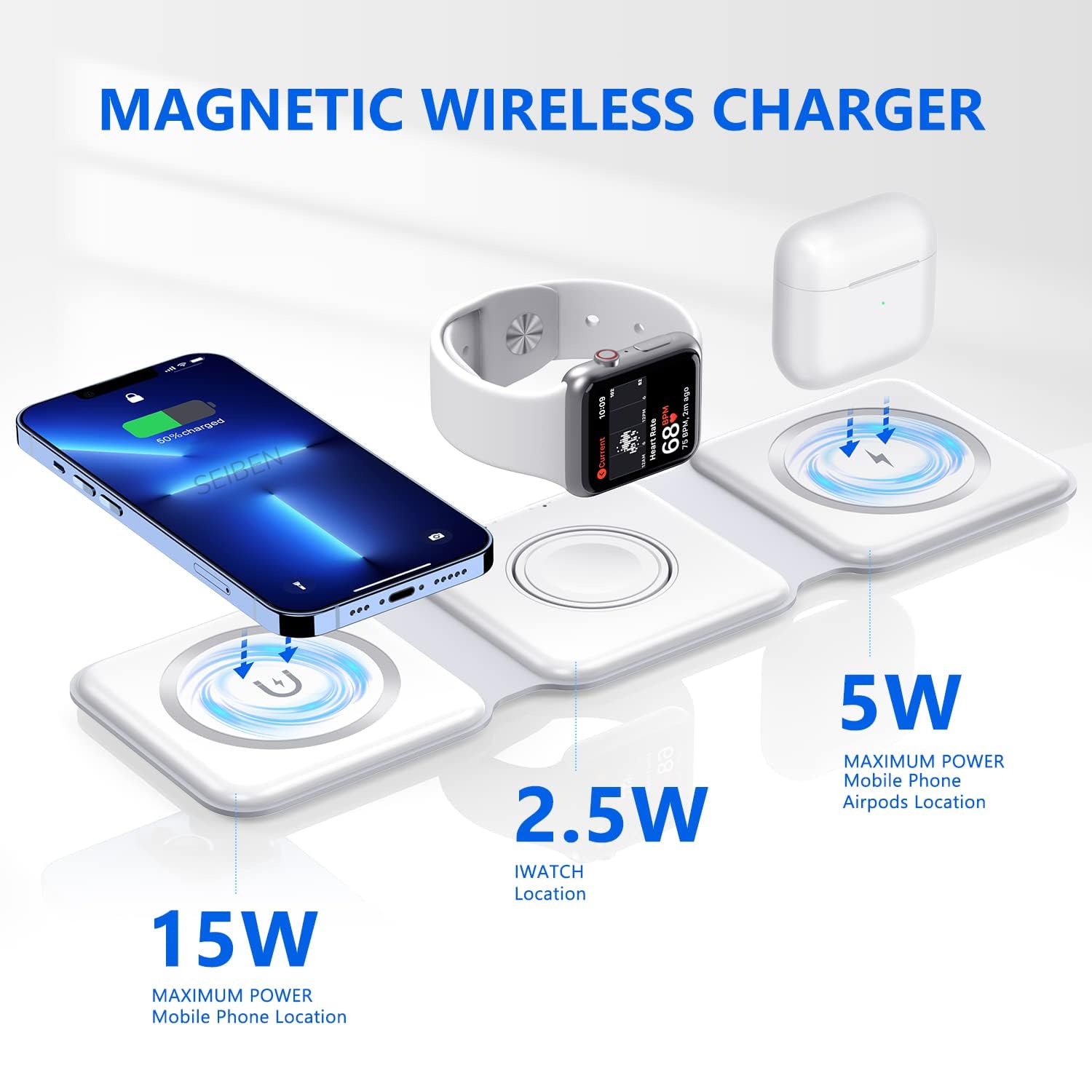 - 3 IN 1 Foldable Charger- 3 in 1 wireless charger integrates three charging modules for Apple devices, iPhone, iWatch, AirPods. Quick charging with a maximum power of 15W for cell phone charging, 5W for Airpods charging and 2.5W for iWatch charging, which can charge three devices at the same time, convenient and efficient, perfectly solving the problem of charging multiple devices.